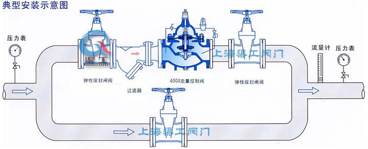 400X流量控制閥由主閥、流量調(diào)節(jié)閥、針閥、導(dǎo)閥、球閥、微形過(guò)濾器和壓力表組成水力控制接管系統(tǒng)。利用水力自動(dòng)操作,控制和調(diào)節(jié)主閥開(kāi)度,使通過(guò)主閥的流量保持不變。